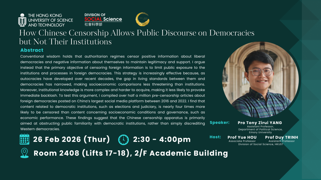 Conventional wisdom holds that authoritarian regimes censor positive information about liberal democracies and negative information about themselves to maintain legitimacy and support. I argue instead that the primary objective of censoring foreign information is to limit public exposure to the institutions and processes in foreign democracies. This strategy is increasingly effective because, as autocracies have developed over recent decades, the gap in living standards between them and democracies has narrowed, making socioeconomic comparisons less threatening than institutions. Moreover, institutional knowledge is more complex and harder to acquire, making it less likely to provoke immediate backlash. To test this argument, I compiled over half a million pre-censorship articles about foreign democracies posted on China’s largest social media platform between 2016 and 2022. I find that content related to democratic institutions, such as elections and judiciary, is nearly four times more likely to be censored than content concerning socioeconomic conditions and governance, such as economic performance. These findings suggest that the Chinese censorship apparatus is primarily aimed at obstructing public familiarity with democratic institutions, rather than simply discrediting Western democracies. READ MORE...